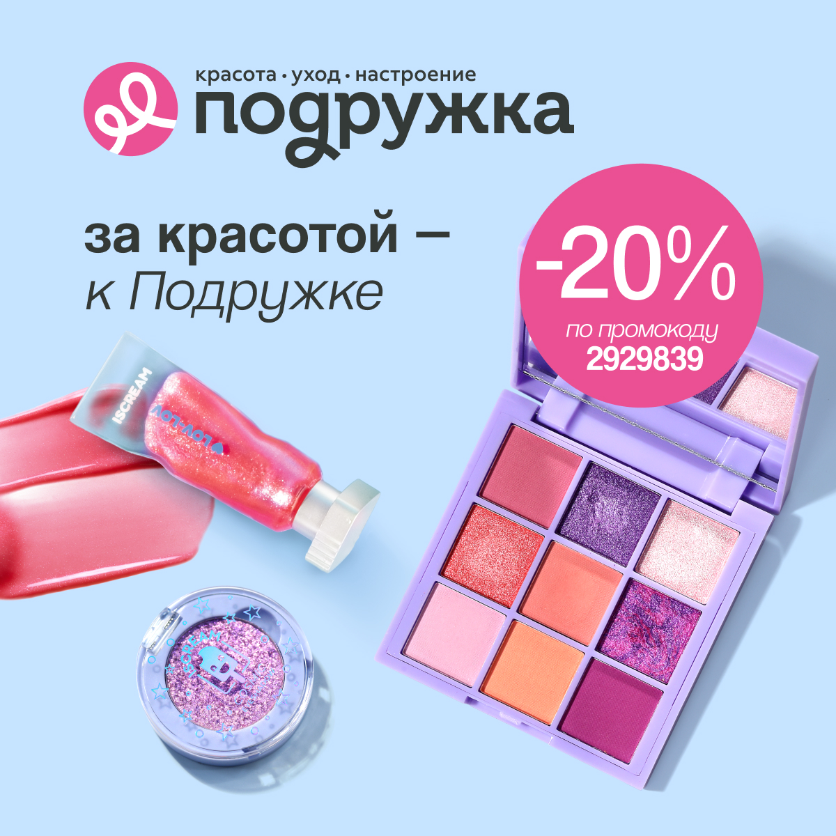 Cеть магазинов косметики «Подружка» дарит скидку 20 % по промокоду промокод на 20 % - 2929839 на бьюти-шопинг для детей и взрослых!