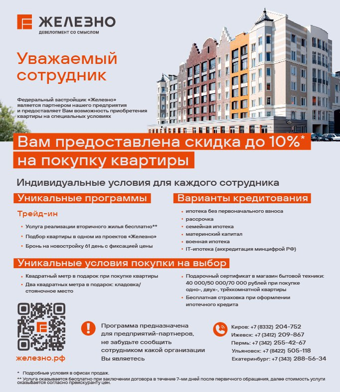 За 13 лет работы компании удалось обосноваться в федеральном ТОП-5 застройщиков по потребительским качествам жилья (рейтинг Единого ресурса застройщиков) и стать по-настоящему федеральной компанией – сегодня квартиры от «Железно» можно приобрести в Кирове, Ижевске, Екатеринбурге, Перми и Ульяновске.